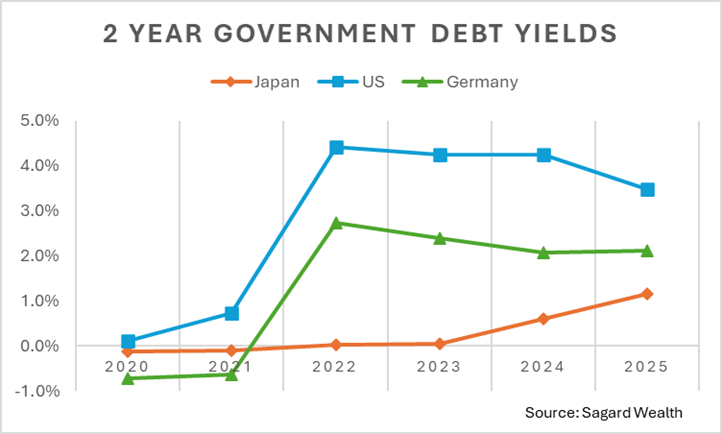 Central bankers have much more influence over the front-end of the yield curve (short term debt) where the policy rate is much more impactful. Most central banks have been cutting their policy rates over the last 2 years, as inflation has cooled down. These changes tend to feed through quickly into the yield of shorter dated debt, including the 2-year debt. The chart below shows the yield of 2-year government debt across the U.S., Germany and Japan.
